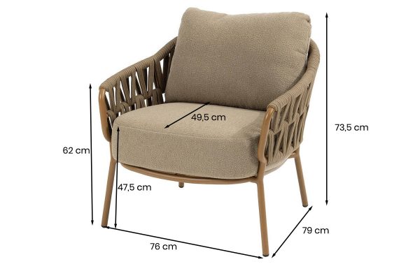 De 4 Seasons Outdoor Biarritz low dining stoel is een moderne stoel voor buiten. Het frame is gemaakt van aluminium met een amberkleurige poedercoating. Dat voelt stevig en toch licht aan wanneer je de stoel verplaatst. De rug en zitting zijn uitgevoerd in strak geweven rope. Dat geeft de stoel een rustige, luchtige uitstraling. Het meegeleverde zitkussen voelt zacht aan en is bekleed met Olefin-stof. Die stof is sterk en kleurvast. De zithoogte is lager dan bij een gewone diningstoel, waardoor je ontspannen zit aan een low dining tafel.