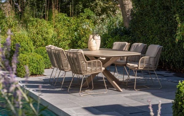Het RVS frame is stevig. De rope bekleding voelt comfortabel aan, ook op warme dagen. De dikke kussens geven extra steun tijdens een lang diner. De Latte kleur past bij veel tuinstijlen. Deze set blijft het hele jaar buiten staan zonder problemen.