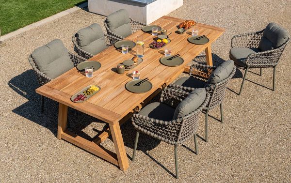 De Jura diningset heeft iets robuusts en tegelijk verfijnds. De warme Terre-kleur doet denken aan zongedroogde aarde en geeft je terras meteen een Zuid-Europese uitstraling. Je ziet het aan de Noah tafel van 260 centimeter: dit is een tafel waaraan je met z'n tienen kunt zitten, maar die toch niet massief overkomt. Het teakhouten blad voelt glad aan.