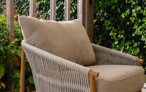De 4 Seasons Outdoor Milos loungestoel is een comfortabele stoel om buiten in tot rust te komen. Het frame is gemaakt van aluminium in de kleur amber. Dat voelt stevig en toch licht aan als je de stoel verplaatst. De zitting en rug zijn afgewerkt met strak gevlochten rope. Dat geeft de stoel een moderne uitstraling. De twee kussens zorgen voor een zachte zit. Ze zijn bekleed met Olefin, een sterke en kleurvaste buitenstof. Met een breedte van ongeveer 80 cm en een diepte van 73 cm heeft de stoel een royale zit. De zithoogte ligt rond de 45 cm, waardoor je prettig zit als je wat rechter wilt loungen.