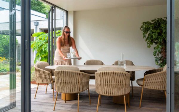 De Molina diningset met Colorado keramische tafel heeft een natuurlijke uitstraling. Zes stoelen in de warme kleur Amber staan rond een tafel van 240 cm. Het dikke rope vlechtwerk is met de hand gevlochten. Het keramische tafelblad heeft een travertin look die het geheel afmaakt.