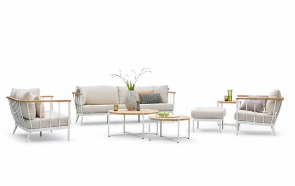 De Apple Bee Condor loungeset is een oase van comfort. Een 3-zitsbank, 2-zitsbank en loungestoel met zachte, gebogen ruggen die je omarmen, gecombineerd met drie ronde tafels in oplopende formaten voor die perfecte flow. De mat gepoedercoate oyster kleur frames stralen rust uit, de teakhouten leuningen voegen een vleugje natuur toe en de royale Bee Wett® kussens met grove weefstructuur en soft touch maken elke middag tot een luie droom.