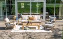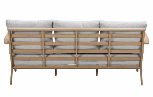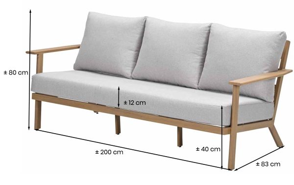 De Garden Impressions Chicago lounge sofa biedt plek voor drie personen en heeft een breed, uitnodigend zitoppervlak. De dikke kussens veren licht mee als je gaat zitten. Het aluminium frame heeft een houtstructuurprint die echt op teak lijkt, inclusief de nerven en kleurverschillen. Daardoor krijg je de uitstraling van hout zonder dat je elk jaar hoeft te oliën. De brede armleuningen geven steun en maken de bank ook geschikt om languit te liggen met een kussen onder je hoofd. Zet er een loungetafel voor en een fauteuil naast, en je hebt een complete zithoek in dezelfde stijl.