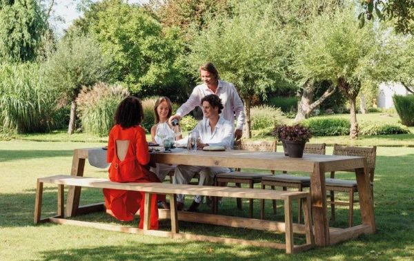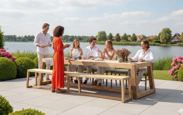 De Gescova Hermosa diningtafel is een grote tafel voor in je tuin. Het blad en het frame zijn volledig van teakhout. Dat is zeer stevig. Met een afmeting van 300 × 100 cm heb je veel ruimte op het blad voor borden, schalen en glazen. De tafelhoogte van ongeveer 76 cm sluit goed aan bij gewone diningstoelen. Het teakhout zal buiten langzaam vergrijzen, wat de tafel een doorleefde, natuurlijke look geeft. Het is zo’n tafel waar je je gezin en vrienden graag omheen verzamelt.
