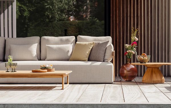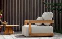 Dit is de Rafa loungeset. Het frame is volledig van teakhout. Dat voelt stevig en natuurlijk aan. De kussens zijn uitgevoerd in de kleur Mario siesta ecru. Ze zijn gemaakt met Agora-stof en quick dry foam. Daardoor voelen de kussens zacht aan. Ze drogen na een bui weer snel op. De zithoogte ligt rond de 38 cm. De zittingen zijn diep en geven ruim steun. De afgeronde vormen zorgen voor een rustige loungehoek die vriendelijk oogt.
