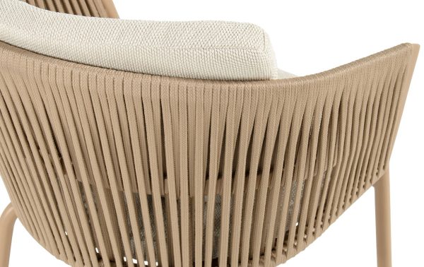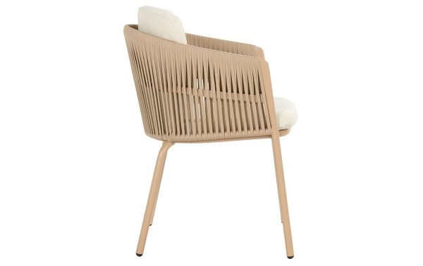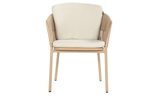 De Hartman Sevilla diningstoel voelt direct prettig zodra je gaat zitten. Het frame is gemaakt van gepoedercoat aluminium in een warme cappuccinotint. Dat materiaal is licht van gewicht, maar geeft toch een stabiel zitgevoel. De zitting heeft een zitdiepte van 43 cm, waardoor je natuurlijk en ontspannen zit aan een tuintafel. Het all-weather voelt zacht aan en blijft mooi bij wisselend weer. De vorm van de rugleuning geeft lichte ondersteuning zonder hard aan te voelen. De stoel kan tot 135 kg dragen en is ontworpen voor dagelijks buitengebruik. Het geheel oogt rustig, met een zachte kleurstelling die een kalme sfeer brengt aan je terras.