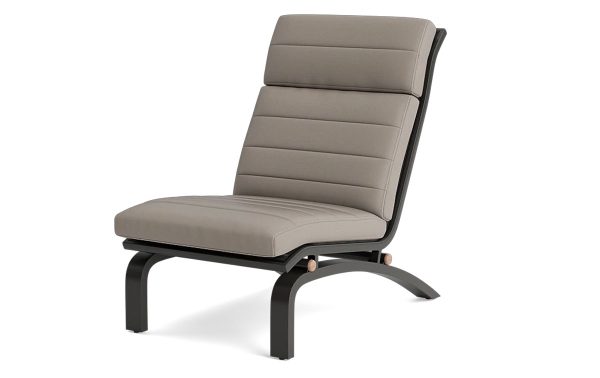 De zitting van textielen is strak ingespannen in een stevig frame. Dat geeft een lichte vering — comfortabel zonder dikke kussens. De schuinte is precies goed: rechtop genoeg voor een gesprek, achterover genoeg om echt te ontspannen.