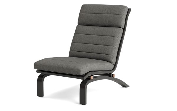 De zitting van textielen is strak ingespannen in een stevig frame. Dat geeft een lichte vering — comfortabel zonder dikke kussens. De schuinte is precies goed: rechtop genoeg voor een gesprek, achterover genoeg om echt te ontspannen.