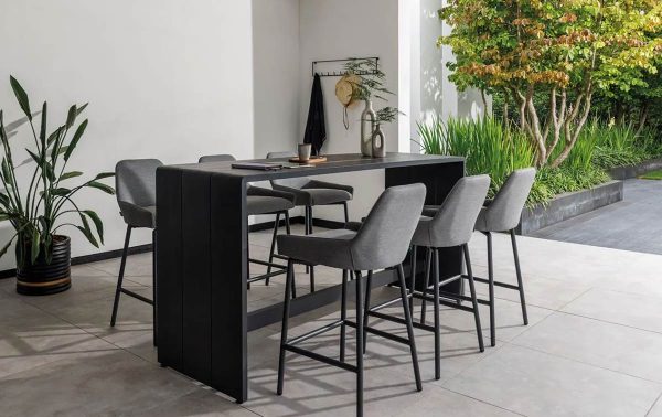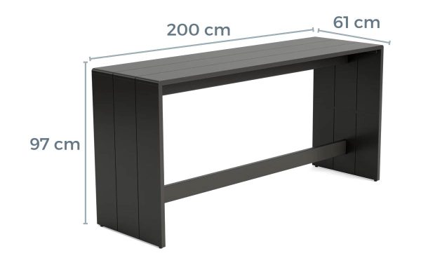 De Lyon bartafel van Life Outdoor Living valt op door zijn strakke, donkere uitstraling. Het Lava-gekleurde aluminium frame heeft een diepgrijze tint die in het licht bijna mat aanvoelt. Ook het tafelblad is van aluminium, wat de tafel een modern geheel maakt. Met 200 cm lengte biedt de Lyon ruimte aan zes personen. De hoogte van 97 cm is precies goed voor een barkruk of hoge stoel.
