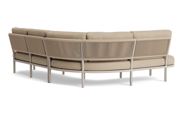 De Life Outdoor Living Olympus loungeset in Beige met Bouclé Sand kussens trekt de aandacht door zijn vloeiende, ronde vormen. Het aluminium frame heeft een lichte beige tint en het RuCore+ touw in de rugleuning voelt zacht aan onder je handen. De bouclé stof van de kussens heeft die kenmerkende bolvormige textuur die je van binnen kent. Het voelt prettig aan en geeft de set een huiselijke uitstraling. De rugleuning ondersteunt goed, waardoor je ook na een paar uur nog comfortabel zit.