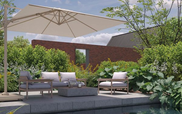 - 360° draaibare voet en T²-kantelsysteem: de parasol volgt de zon, zonder dat je hem hoeft te verplaatsen