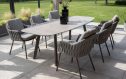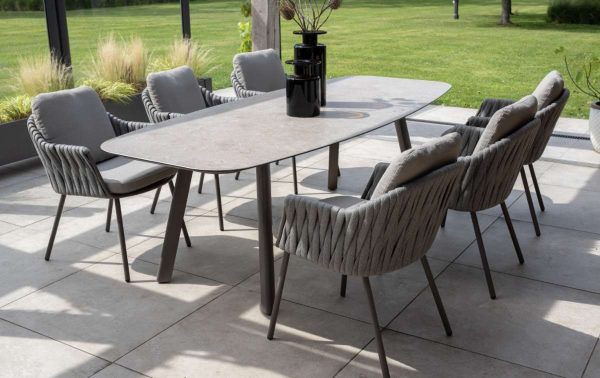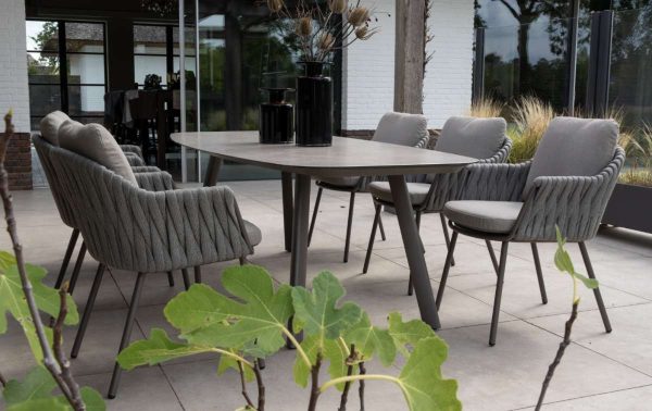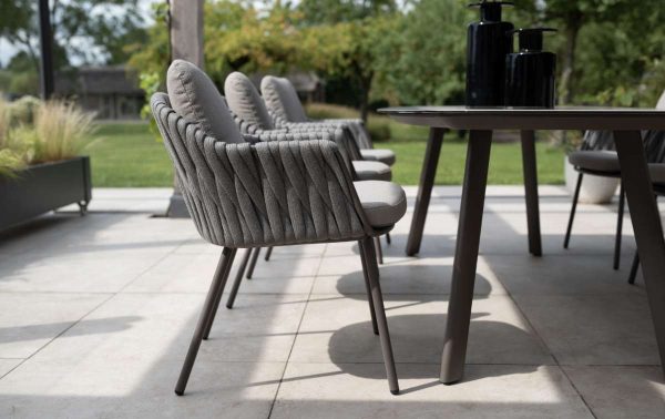 De Taste by 4SO Cannes diningset met Prado tafel  straalt rust uit. De terre-kleur voelt warm aan. Het keramische tafelblad heeft een matte uitstraling die mooi contrasteert met het rope-vlechtwerk van de stoelen. Je ziet meteen dat hier vakmanschap in zit. De combinatie van materialen geeft de set karakter. Rope en aluminium samen, dat maakt het geheel licht en toch stevig. De Prado tafel van 240 cm biedt plek aan het hele gezin.