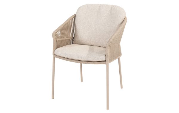 Het aluminium frame van de Florence stoelen heeft een poedercoating in Latte. De kuipvorm van de stoelen zorgt voor goede ondersteuning. De rug- en armleuningen lopen mooi in elkaar over. De zachte kussens maken lang zitten comfortabel. De ronde Prado tafel heeft een keramisch blad dat krasbestendig is. Het aluminium onderstel geeft stevigheid.