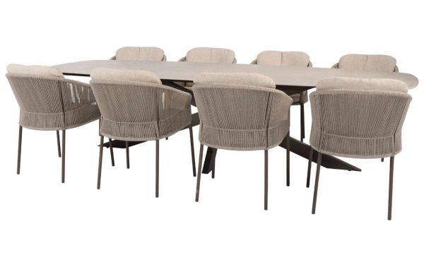 De Florence diningset met Prado keramiek tafel biedt ruimte voor grote gezelschappen. Acht stoelen in de aardetint Terre staan rond een imposante tafel van 300 cm. Het strak geweven rope vlechtwerk heeft een luchtige structuur. Het keramische tafelblad in barrelvorm maakt indruk.