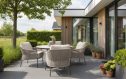 Het aluminium frame van de Florence low dining stoelen heeft een poedercoating in Terre. De lagere zithoogte maakt ontspannen tafelen mogelijk. Het rope vlechtwerk is strak geweven. De comfortabele kussens nodigen uit om lang te blijven zitten. De Sarah tafel is robuust en stevig. Het keramische blad vraagt geen onderhoud.