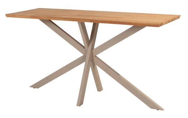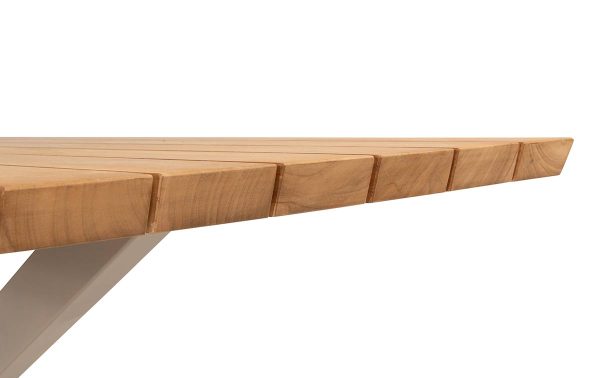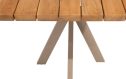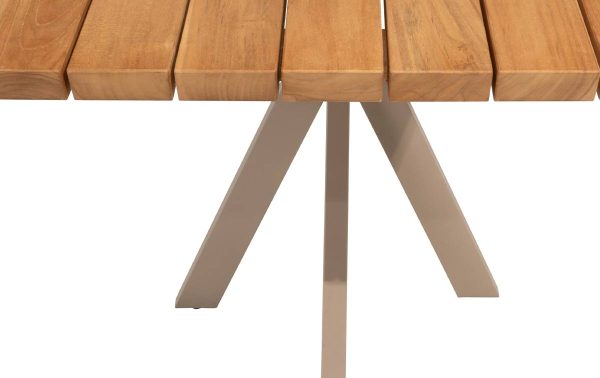 De warme latte kleur van het teak geeft de tafel een uitnodigende uitstraling, perfect voor elke tuin of terras. En omdat teak van nature bestand is tegen de elementen, kun je er het hele jaar door van genieten. Of het nu regent of de zon schijnt, deze tafel blijft mooi.