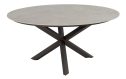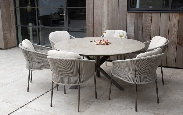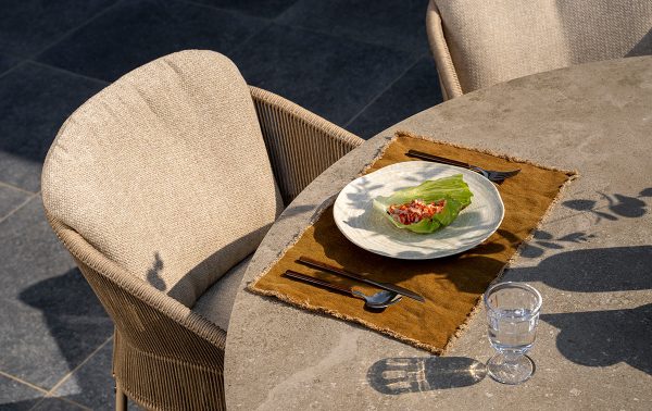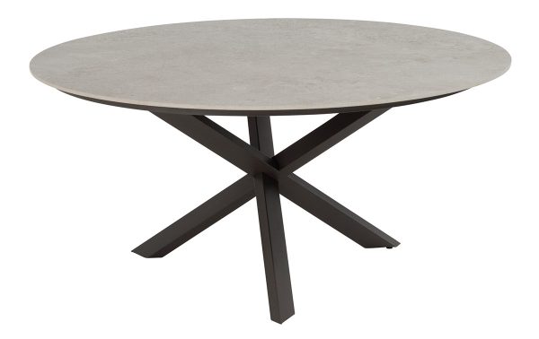 Met een diameter van 160 cm zit je gezin of een groter gezelschap er gemakkelijk met z'n allen aan. Geen gedrang, gewoon lekker ruimte. Het keramisch blad ziet eruit als natuursteen, maar gedraagt zich heel anders. Je zet er warme schalen op neer, de zon staat er de hele dag op en regen maakt hem niks uit.